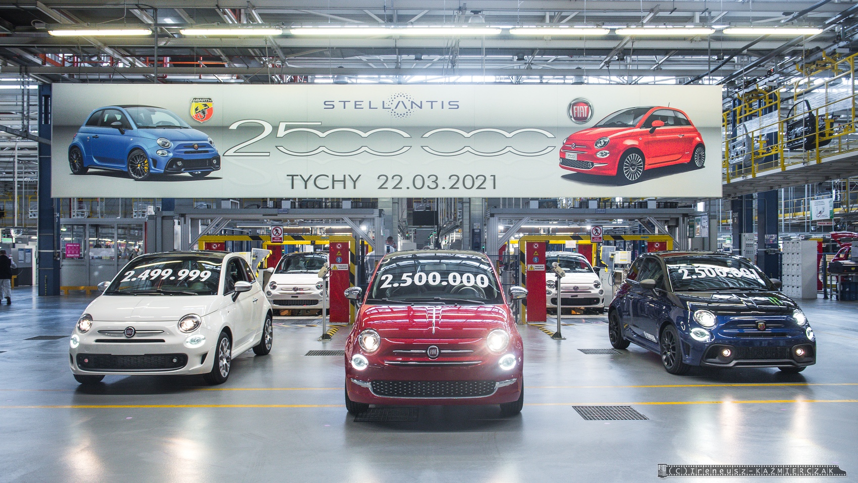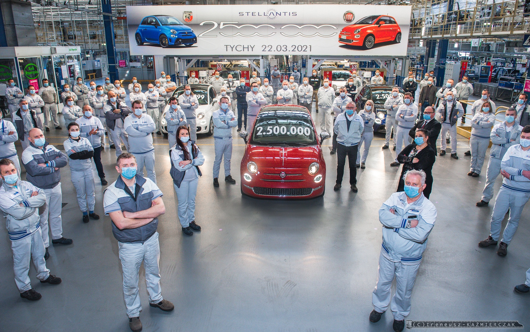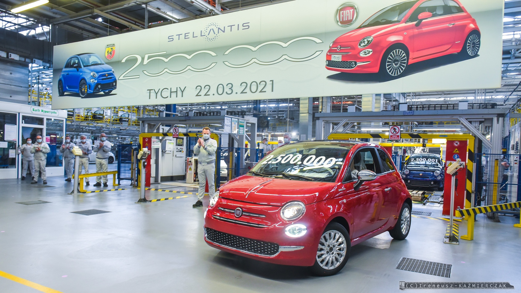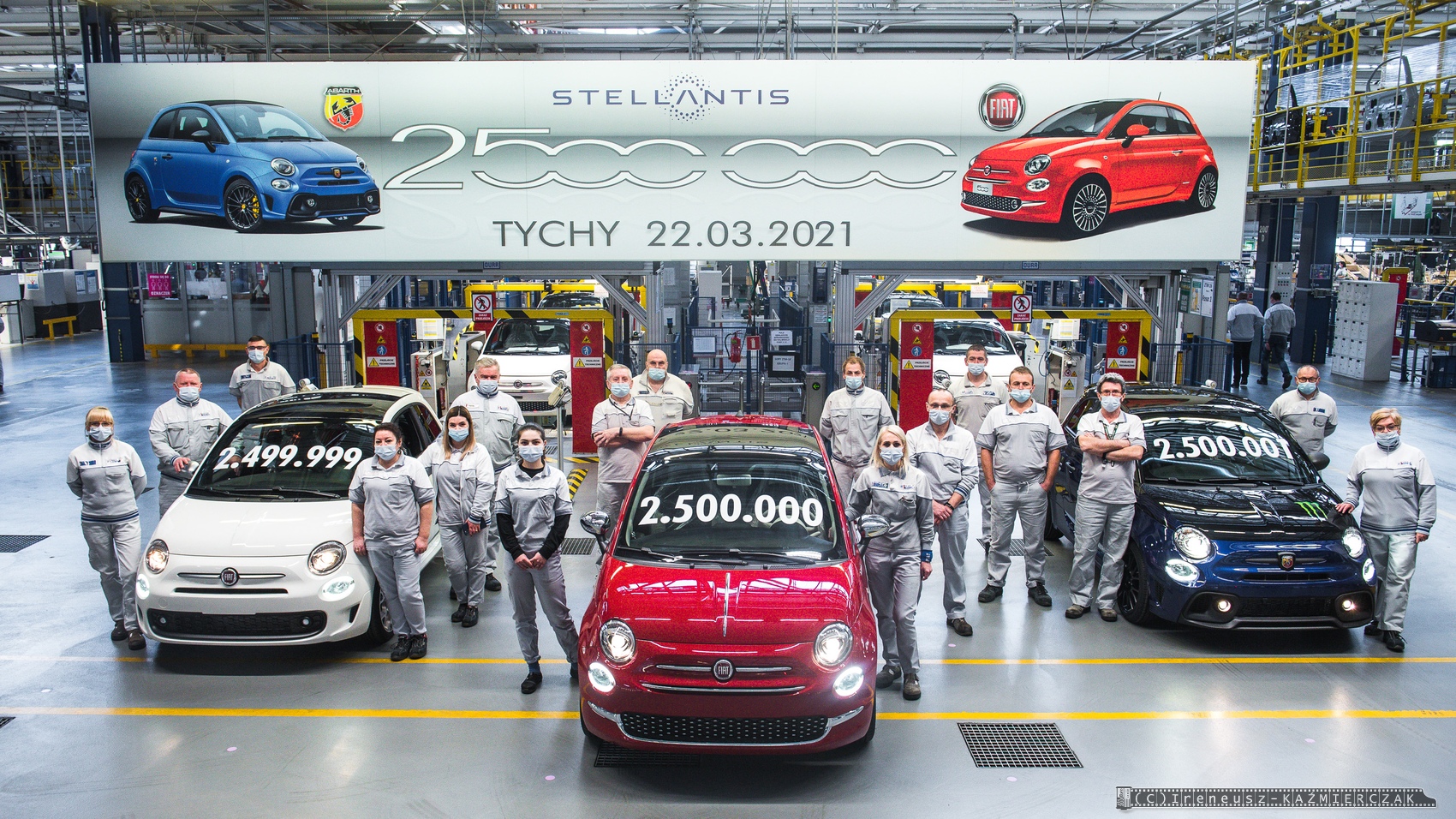 22.03.2021 – Dwuipółmilionowy samochód z rodziny Fiata 500 został wyprodukowany w zakładach Stellantis w Tychach. Jubileuszowa „pięćsetka” zjechała z taśm montażowych w poniedziałek, 22 marca 2021 roku, i jest nią Fiat 500 w wersji Dolcevita, zamówiony przez klienta z Francji. Tradycyjnie już podczas tego typu wydarzeń w polskiej fabryce Fiata wyjątkową oprawę otrzymuje nie tylko jubileuszowy samochód, ale też egzemplarz bezpośrednio go poprzedzający i następny. W tym przypadku nr 2 499 999 przypadł klientowi z Polski, który zamówił wersję Fiat 500 Sport, a numer 2 500 001 to sportowa wersja Abarth 595 Monster Energy Yamaha, która trafi na rynek włoski.