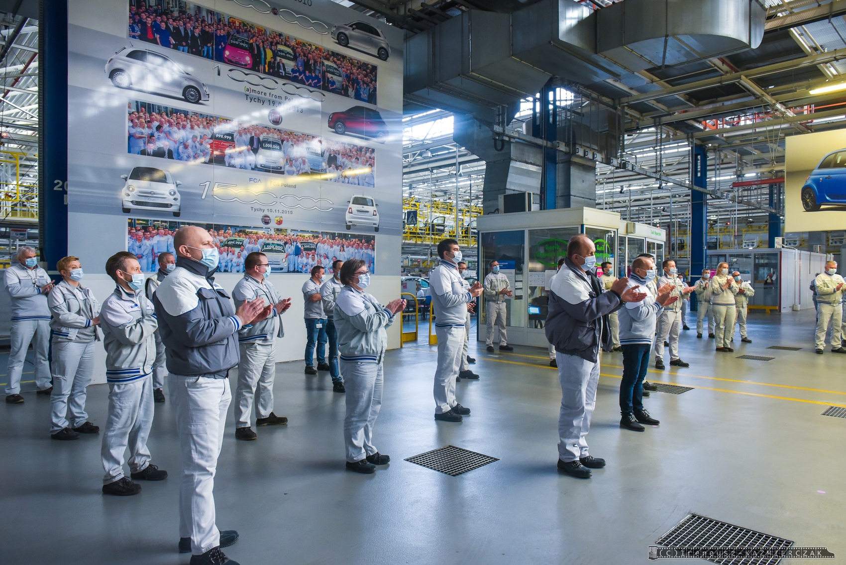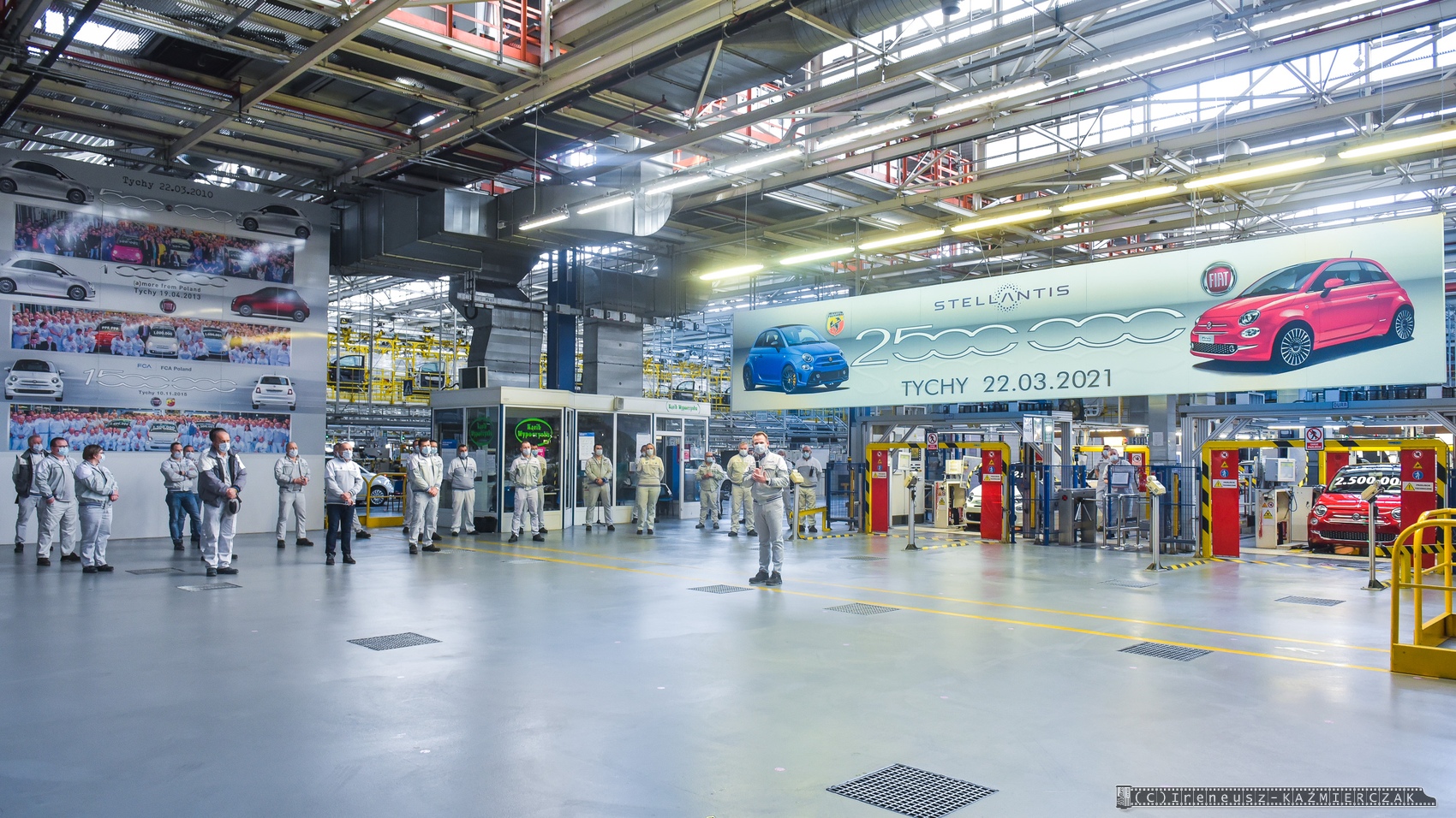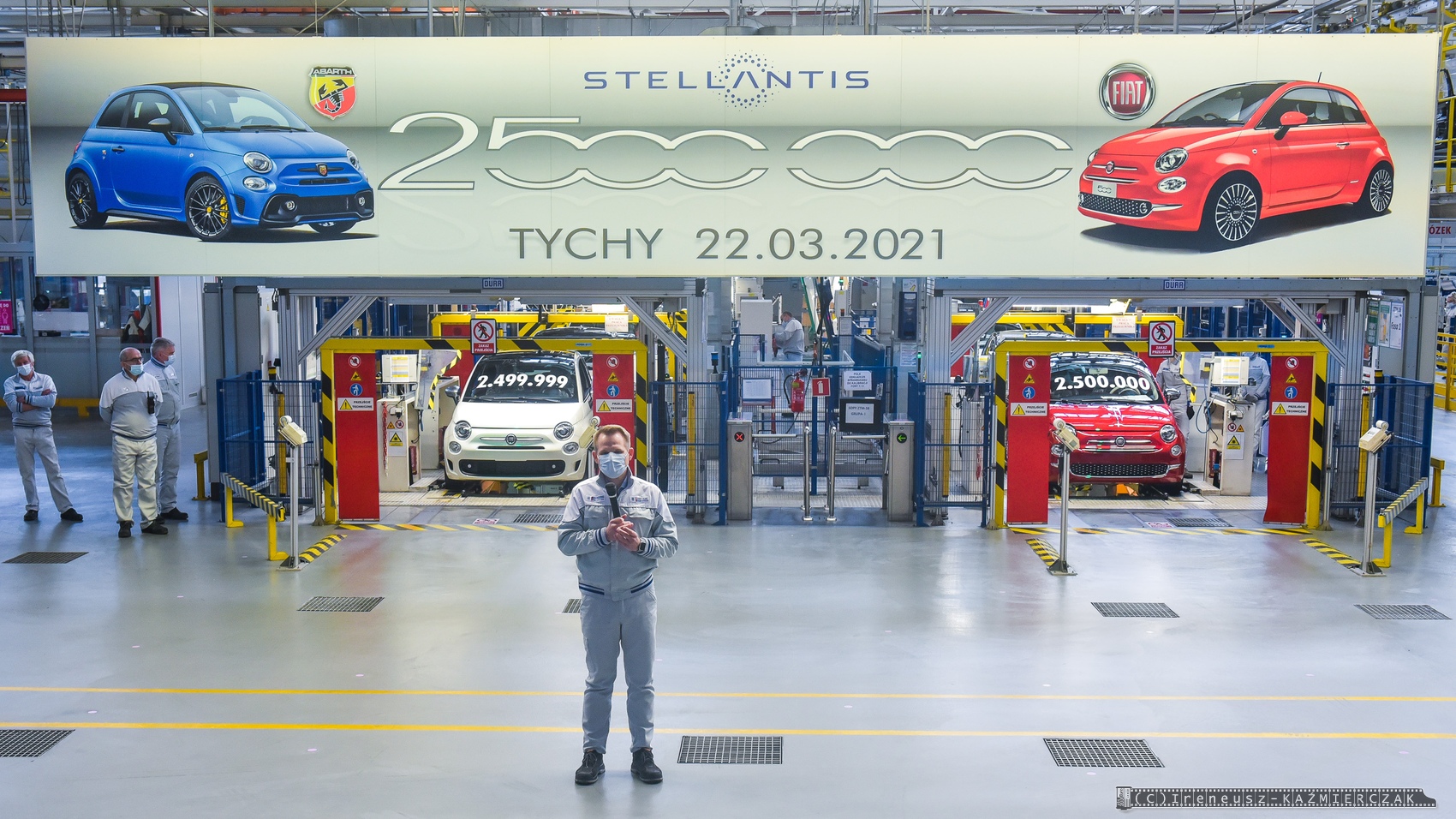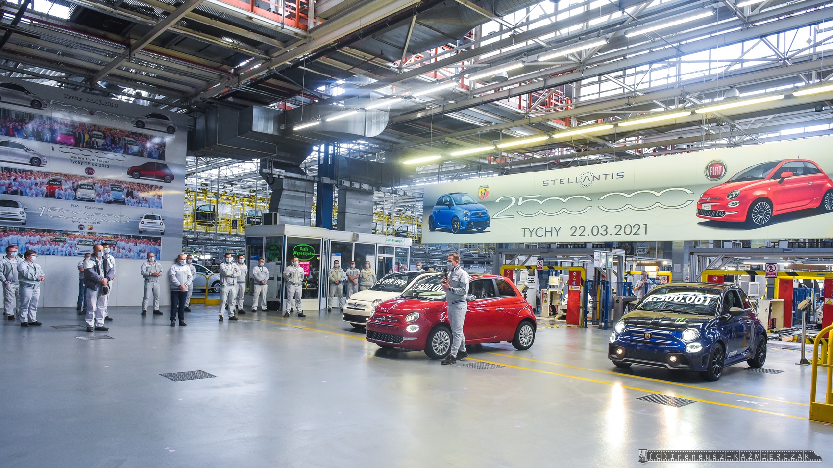 22.03.2021 – Dwuipółmilionowy samochód z rodziny Fiata 500 został wyprodukowany w zakładach Stellantis w Tychach. Jubileuszowa „pięćsetka” zjechała z taśm montażowych w poniedziałek, 22 marca 2021 roku, i jest nią Fiat 500 w wersji Dolcevita, zamówiony przez klienta z Francji. Tradycyjnie już podczas tego typu wydarzeń w polskiej fabryce Fiata wyjątkową oprawę otrzymuje nie tylko jubileuszowy samochód, ale też egzemplarz bezpośrednio go poprzedzający i następny. W tym przypadku nr 2 499 999 przypadł klientowi z Polski, który zamówił wersję Fiat 500 Sport, a numer 2 500 001 to sportowa wersja Abarth 595 Monster Energy Yamaha, która trafi na rynek włoski.